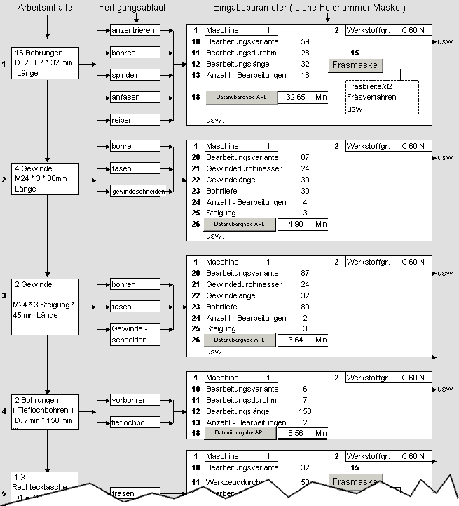 Beispiel einer Arbeitsfolge für einen Würfel Die einzelnen Bearbeitungsschritte sind durchnumeriert und alles, was zur Aufstellung eines passenden Arbeitsplanes mit kostengünstigster Fertigung notwendig ist, ist die Eingabe dieser Positionen in die Eingabemaske. Zur Verdeutlichung diene folgende schematische Aufstellung, welche die bestehenden Zusammenhänge exemplarisch für die ersten Positionen darstellt: Die rechte Spalte ist eine schematische Darstellung der Eingabemaske der Software, in der die zu tätigen Eingaben eingetragen sind.